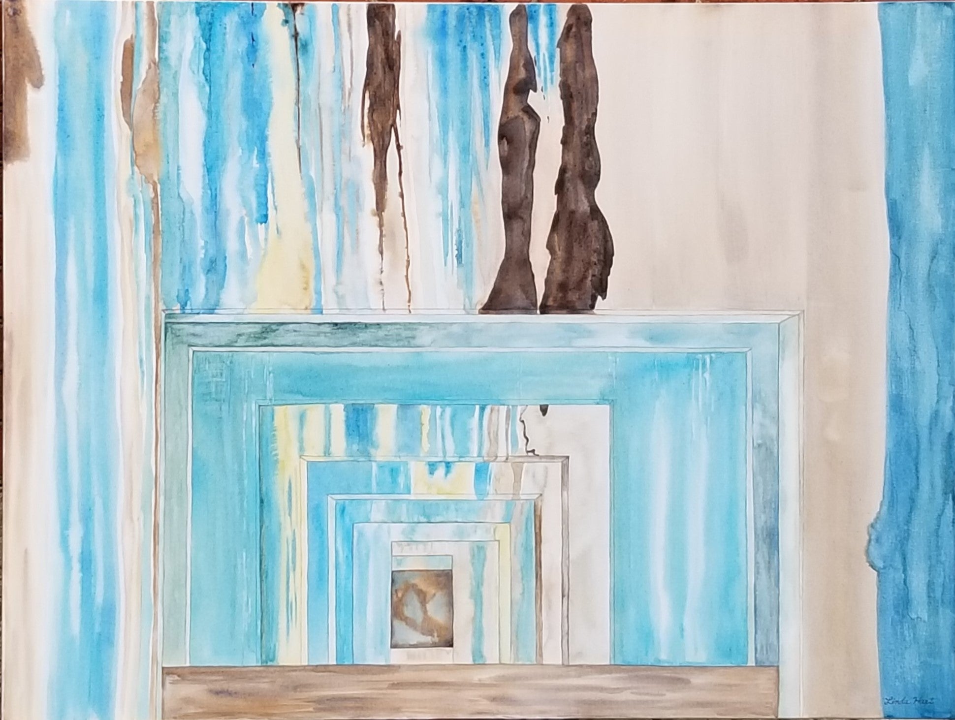 This large 3" x 4' x1.5" watercolor was painted on Fredrix watercolor canvas and was sealed with a fixative so it does not need to be framed under glass under normal conditions.