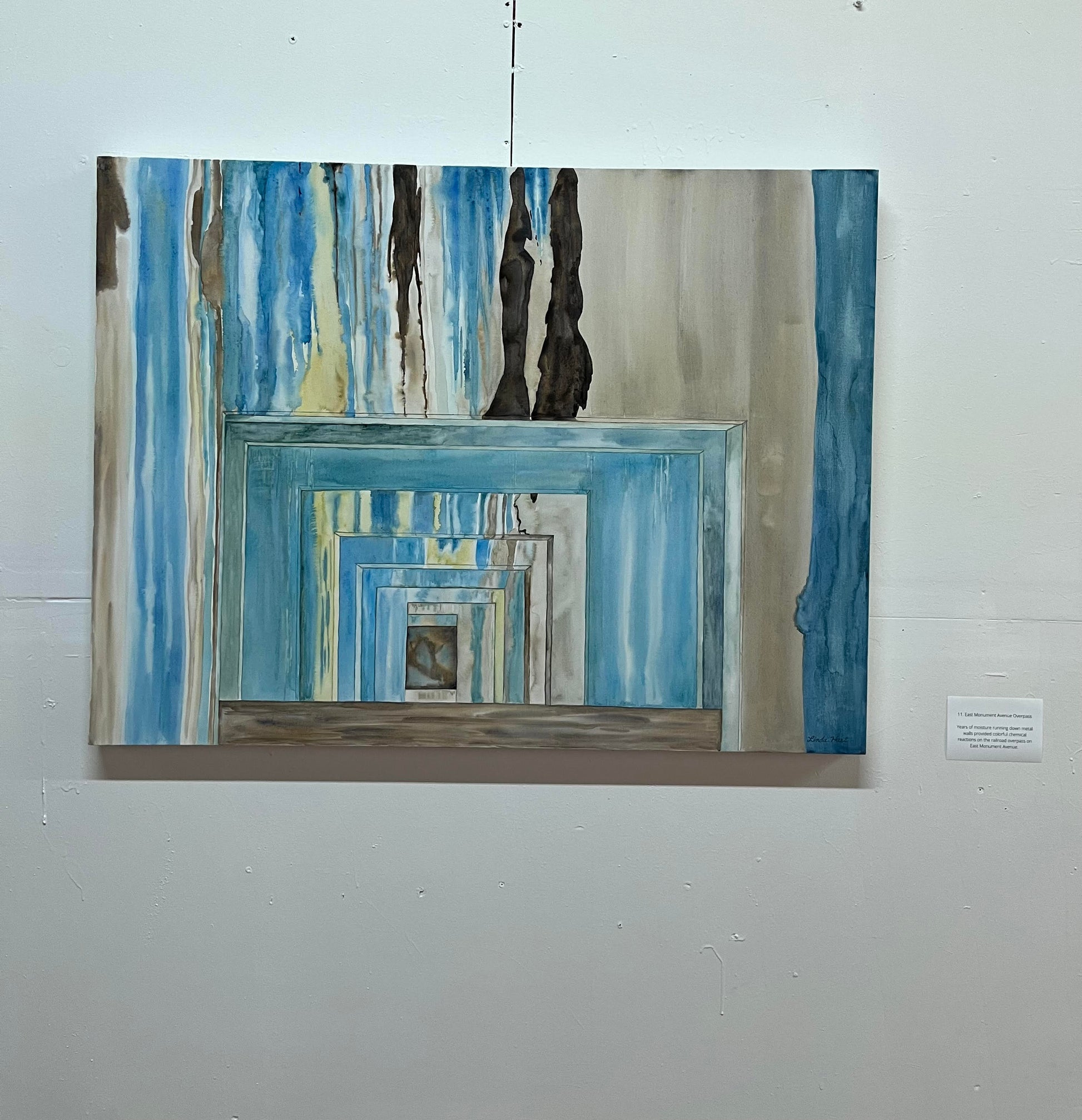 This original watercolor painting shows the years of moisture running down metal walls provided colorful chemical reactions on the railroad overpass on East Monument Avenue.