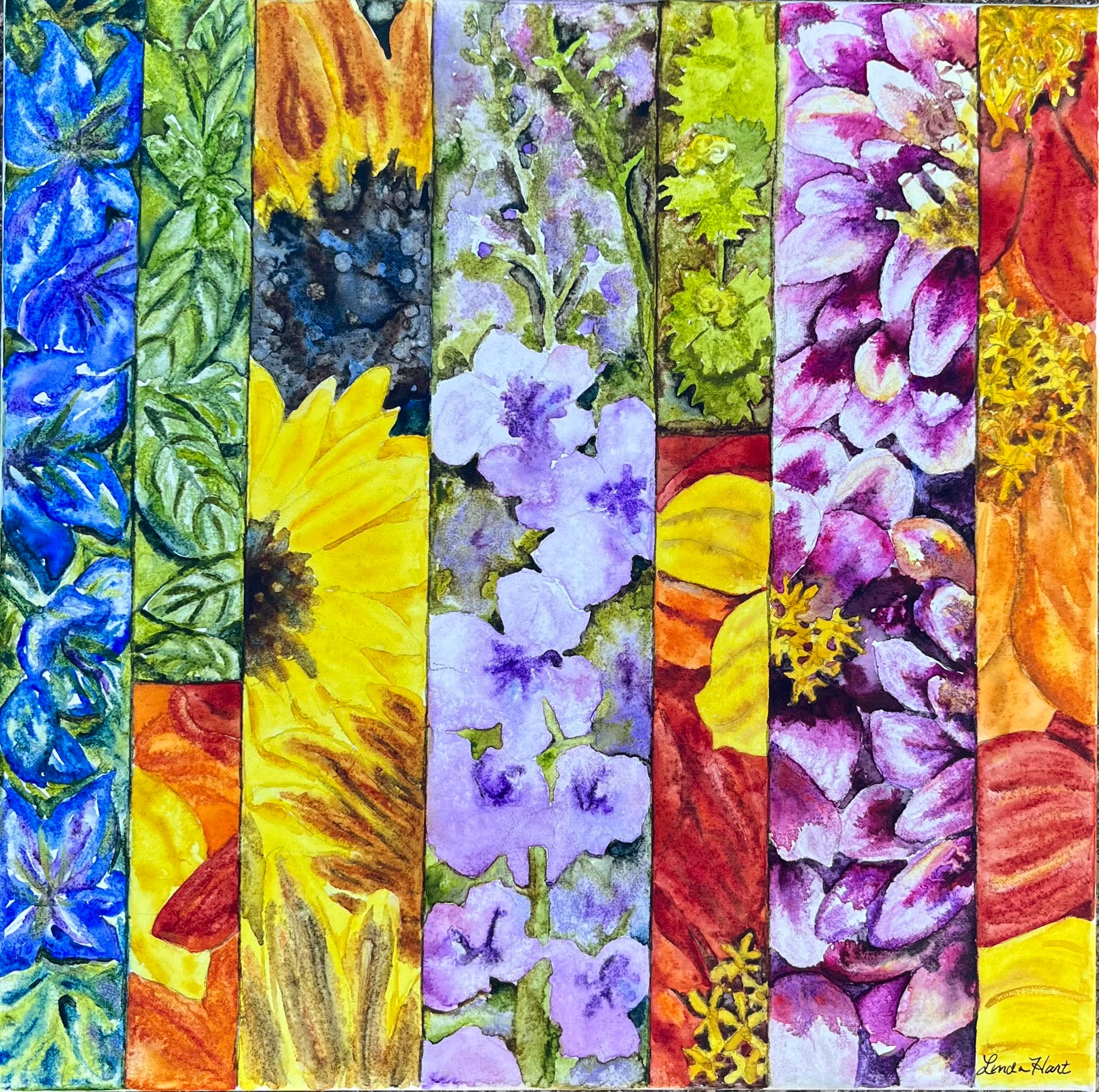 12" x 12" x 1.5" original watercolor by artist Linda Hart featuring floral fragments of Love in the Mist, Basil, Mexican Sunflowers, Verbascum, Ladies Mantle, and Zinnias.