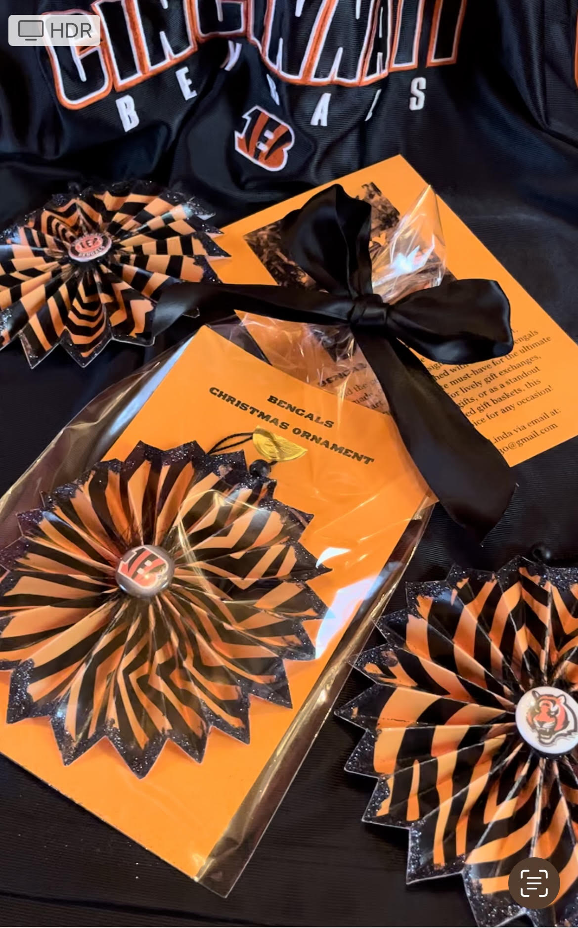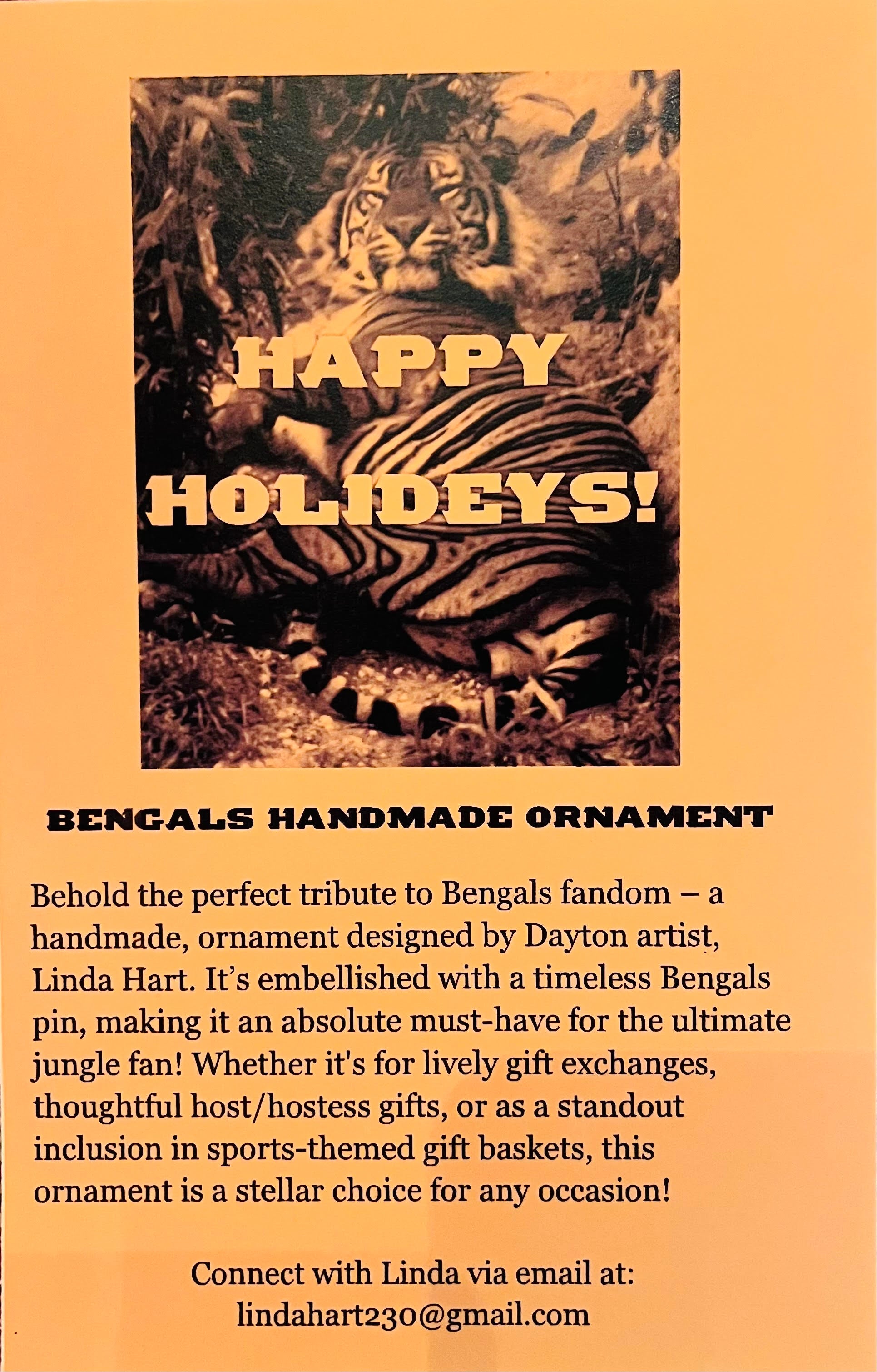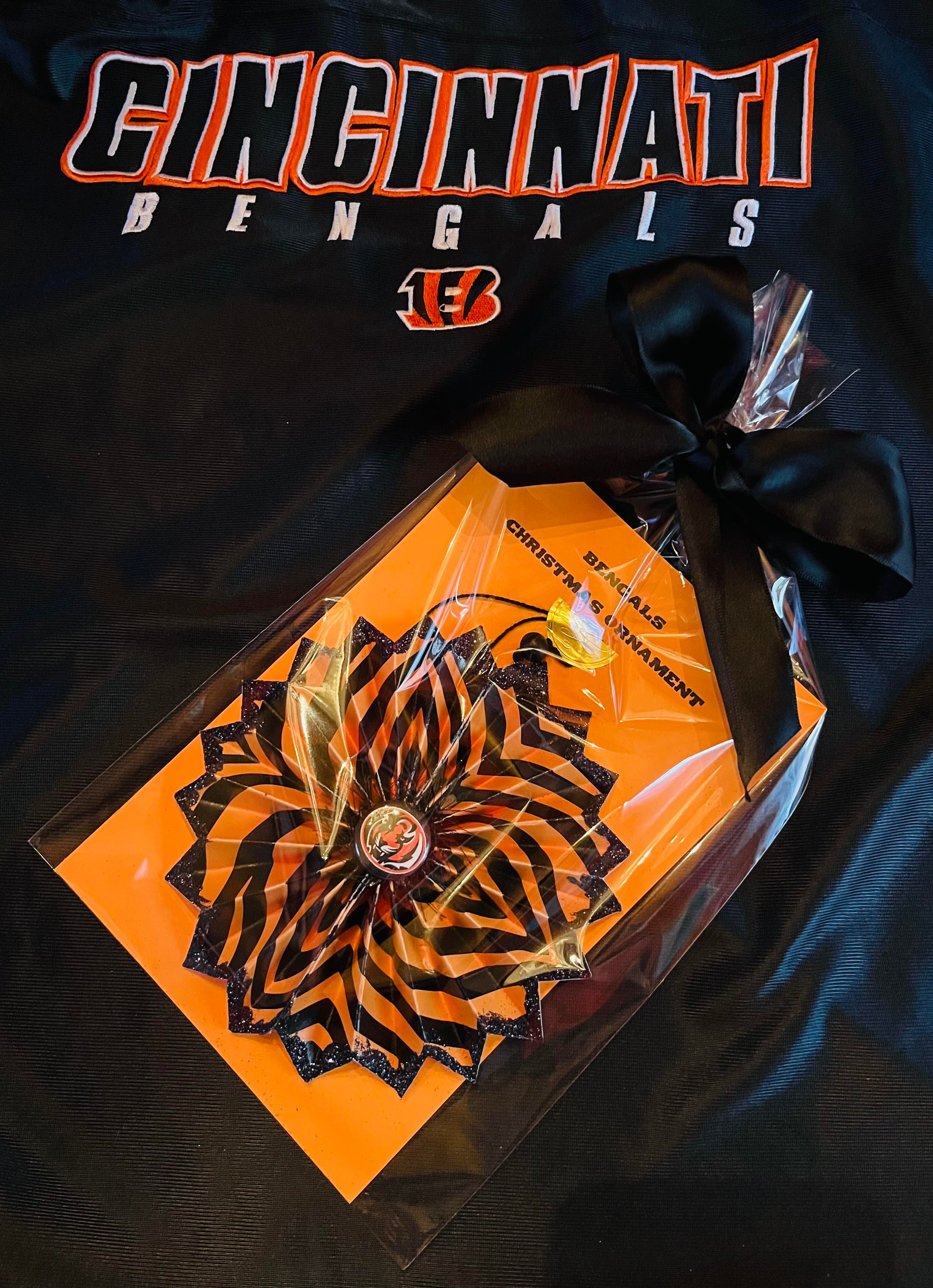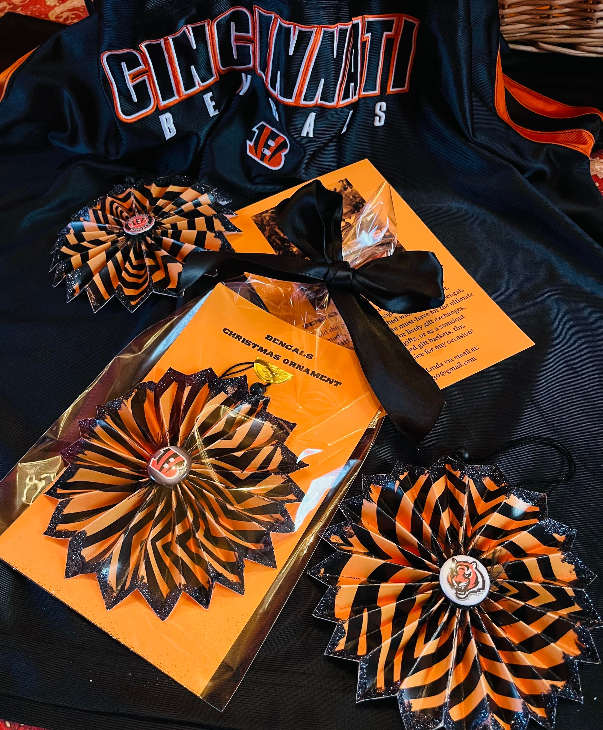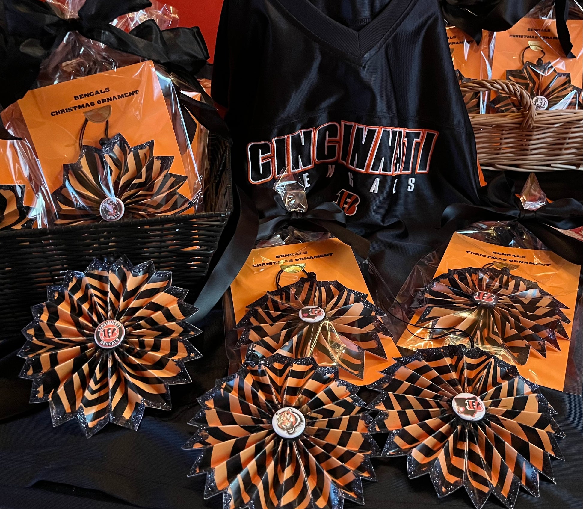 For your favorite Bengals football fan! Featuring foraged Bengals goodies. Behold the perfect tribute to Bengals fandom- a handmade ornament designed by Dayton artist, Linda Hart. It's embellished with a timeless Bengals pin, making it an absolute must-have for the ultimate jungle fan! Whether it's for lively gift exchanges, thoughtful host/hostess gifts, or as a standout addition to sports themed gift baskets, this ornament is a stellar choice for any occasion.