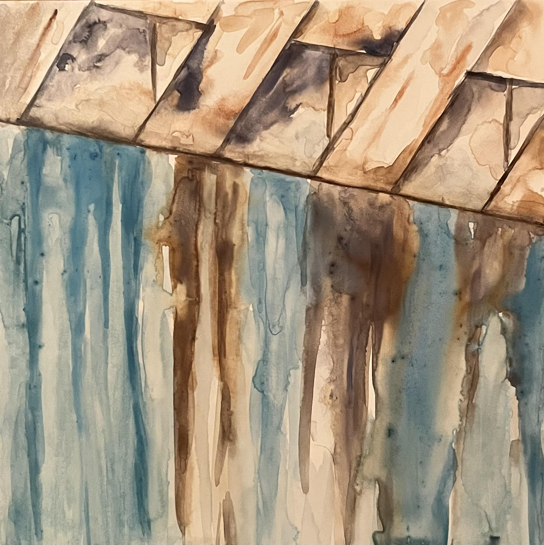 Rusted iron overhead on a very old train overpass combined with years of moisture running down the cement walls provide vibrant color cascading down in this watercolor painting.