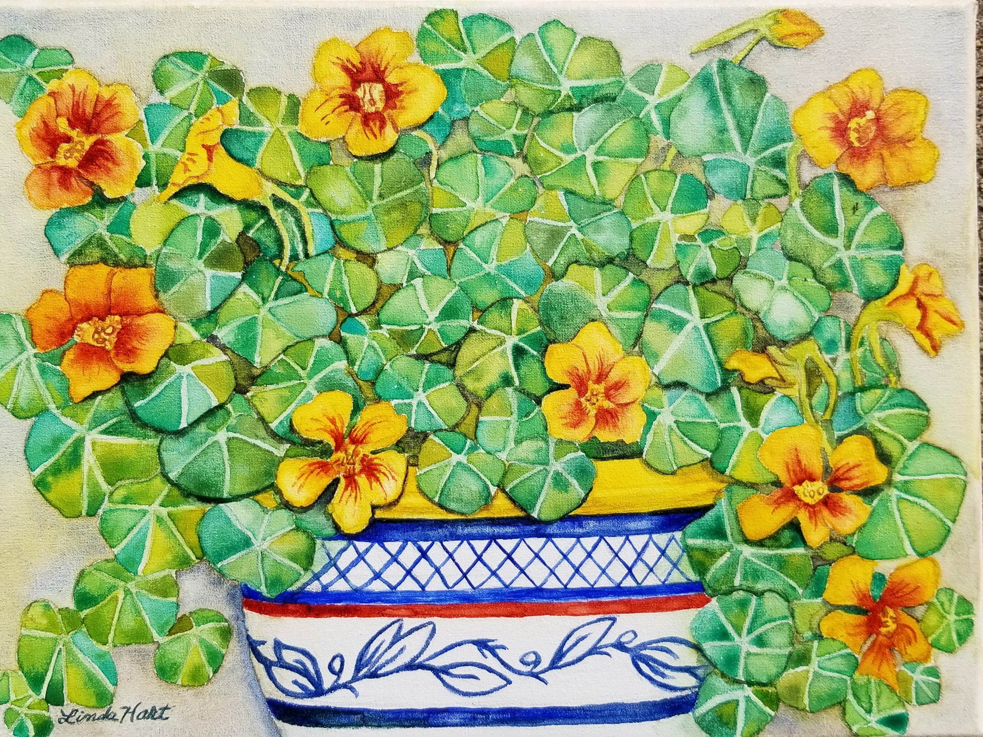 Original watercolor painting on canvas of a blue and white pot of cheery nasturtiums. Their sunny flower faces are whimsical and fun for cheering up any room.
