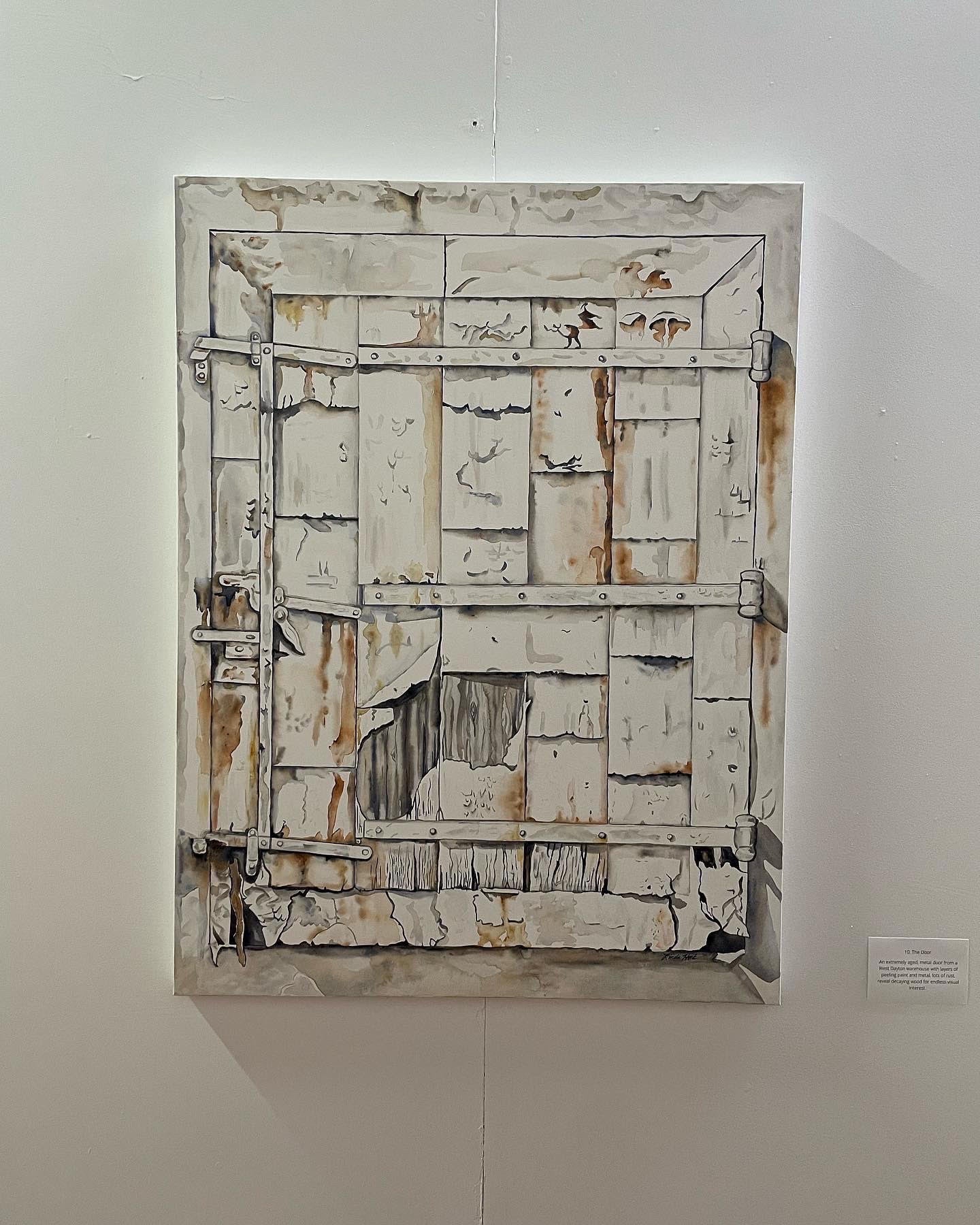 This painting is inspired by an extremely aged, metal door from a West Dayton warehouse with layers of peeling paint and metal, lots of rust, reveal decaying wood for endless visual interest.
